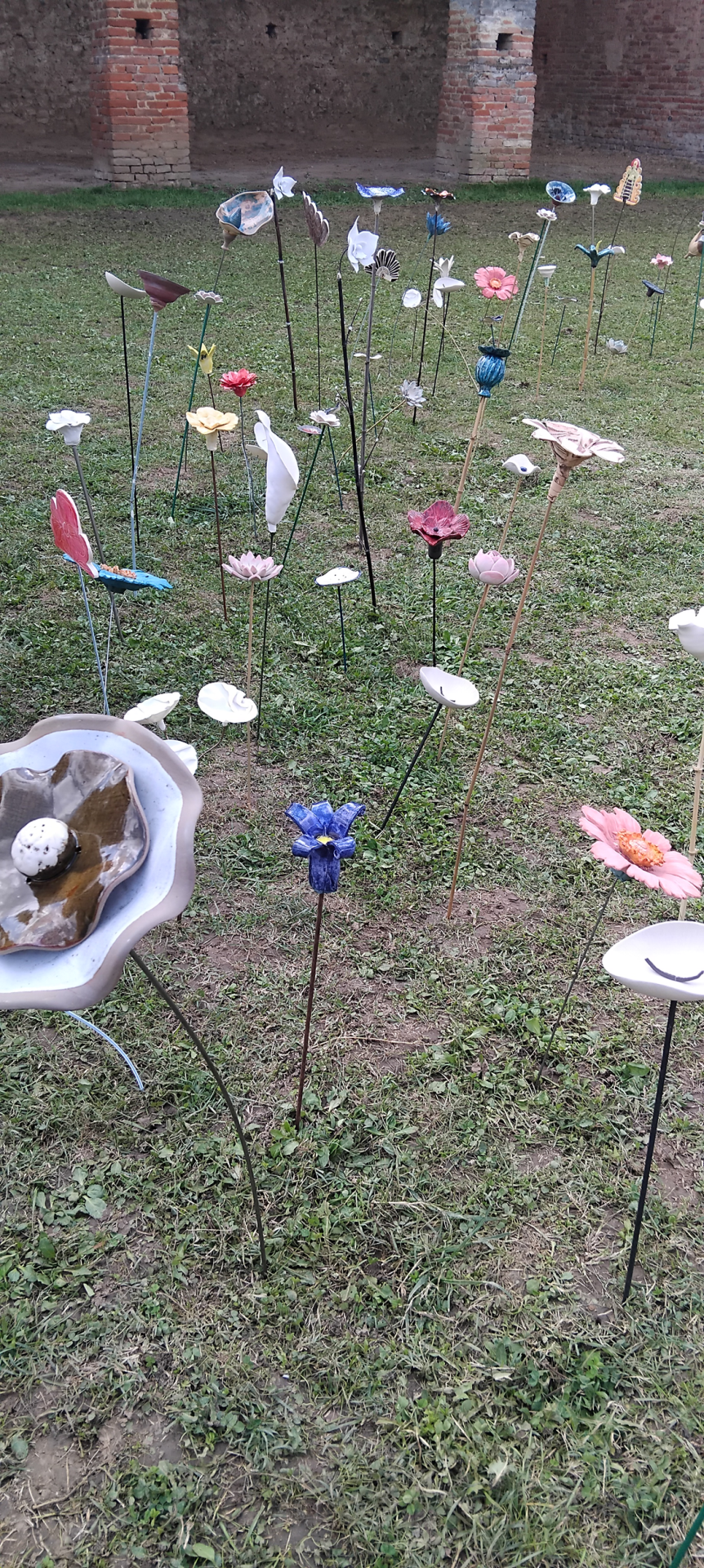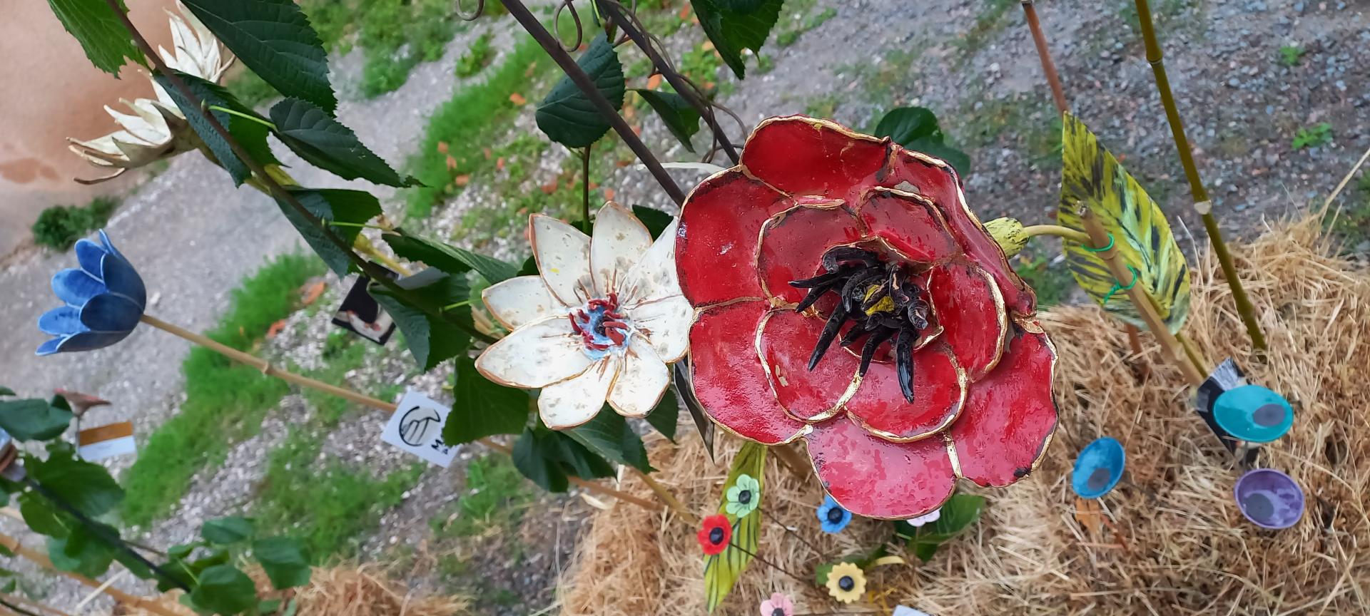 Installation de fleurs en céramique dans les jardins de l'ancien monastère de Sainte-Croix - 15 céramistes participants - 54 place de l'église-temple - 26150 Sainte-Croix.